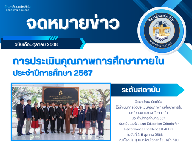 วิทยาลัยนอร์ทเทิร์น ได้ดำเนินการจัดประเมินคุณภาพการศึกษาภายายในระดับคณะ และ ระดับสถาบัน ประจำปีการศึกษา 2567ประเมินโดยใช้เกณฑ์ Education Criteria for Performance Excellence (EdPEx)ในวันที่ 3-5 ตุลาคม 2568ณ ห้องประชุมชนารัตน์ วิทยาลัยนอร์ทเทิร์นโดยมีคณะที่ได้รับการตรวจประเมินฯ จำนวน 5 คณะ ได้แก่ คณะพยาบาบาลศาสตร์คณะศึกษาศาสตร์ คณะบริหารธุรกิจ คณะนิติศาสตร์และรัฐศาสตร์และคณะสหเวชศาสตร์ วิทยาศาสตร์ และเทคโนโลยี